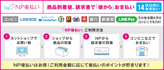 後払いのご注文には、株式会社ネットプロテクションズの後払いサービスが適用され、同社へ代金債権を譲渡します。NP後払い利用規約及び同社のプライバシーポリシーに同意して、後払いサービスをご選択ください。ご利用限度額は累計残高で55,000円(税込)迄です。詳細はバナーをクリックしてご確認下さい。ご利用者が未成年の場合、法定代理人の利用同意を得てご利用ください。ご注文商品が「与信落ち」になった場合、与信落ちが解除されるまで商品が発送できず、お届けが遅れることがございます。詳細についてはネットプロテクションズのウェブサイト(https://np-atobarai.jp/)をご参照ください。